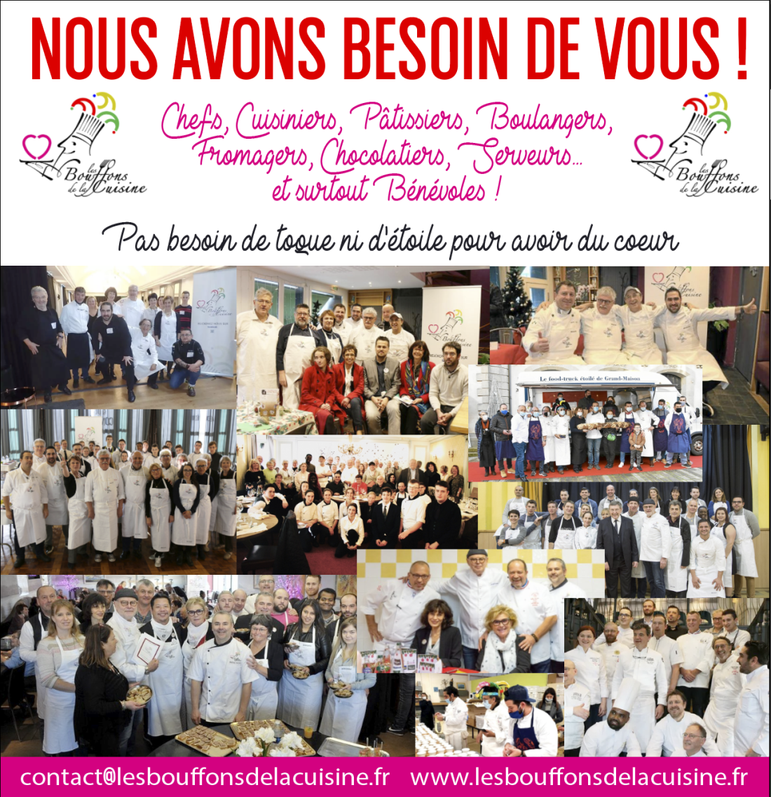 Chefs, Cuisiniers, Pâtissiers, Boulangers, Fromagers, Chocolatiers, Serveurs... et surtout Bénévoles !